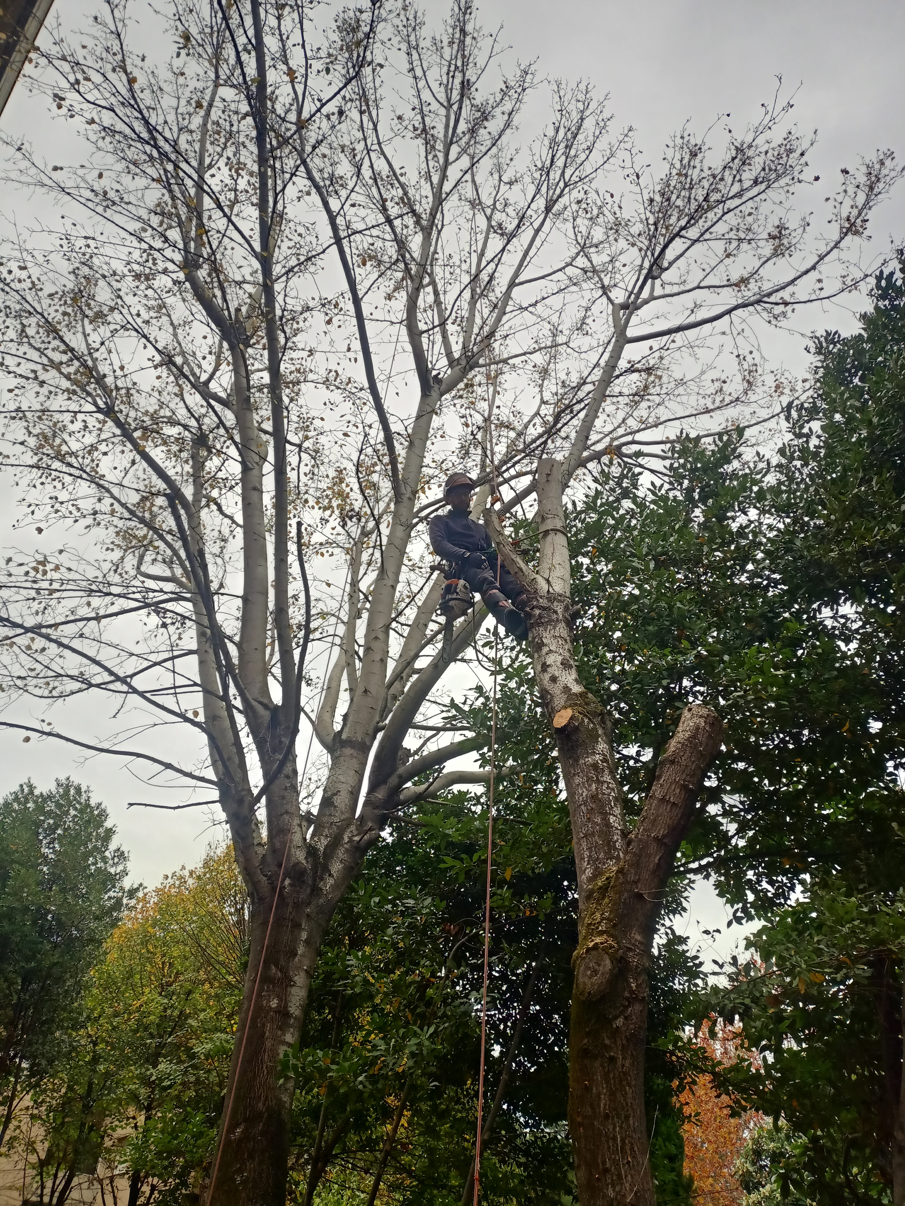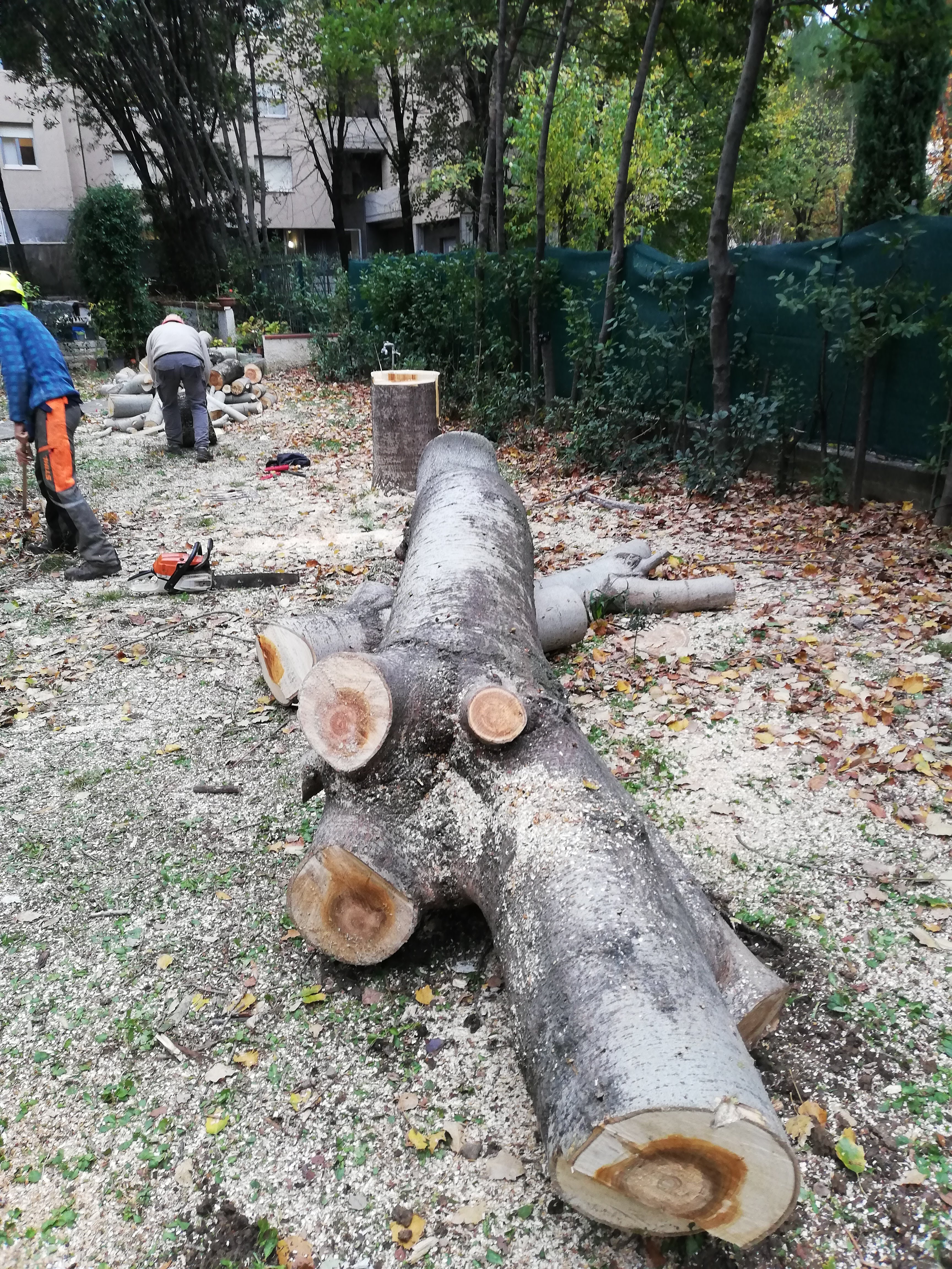 Entrambi i pioppi sono stati tolti rimuovendo e calando la quasi totalità dei rami e del fusto , visto che gli alberi erano molto vicini al fabbricato e alle reti di confine e non potevano essere abbattuti al piede o "sramati in libera".