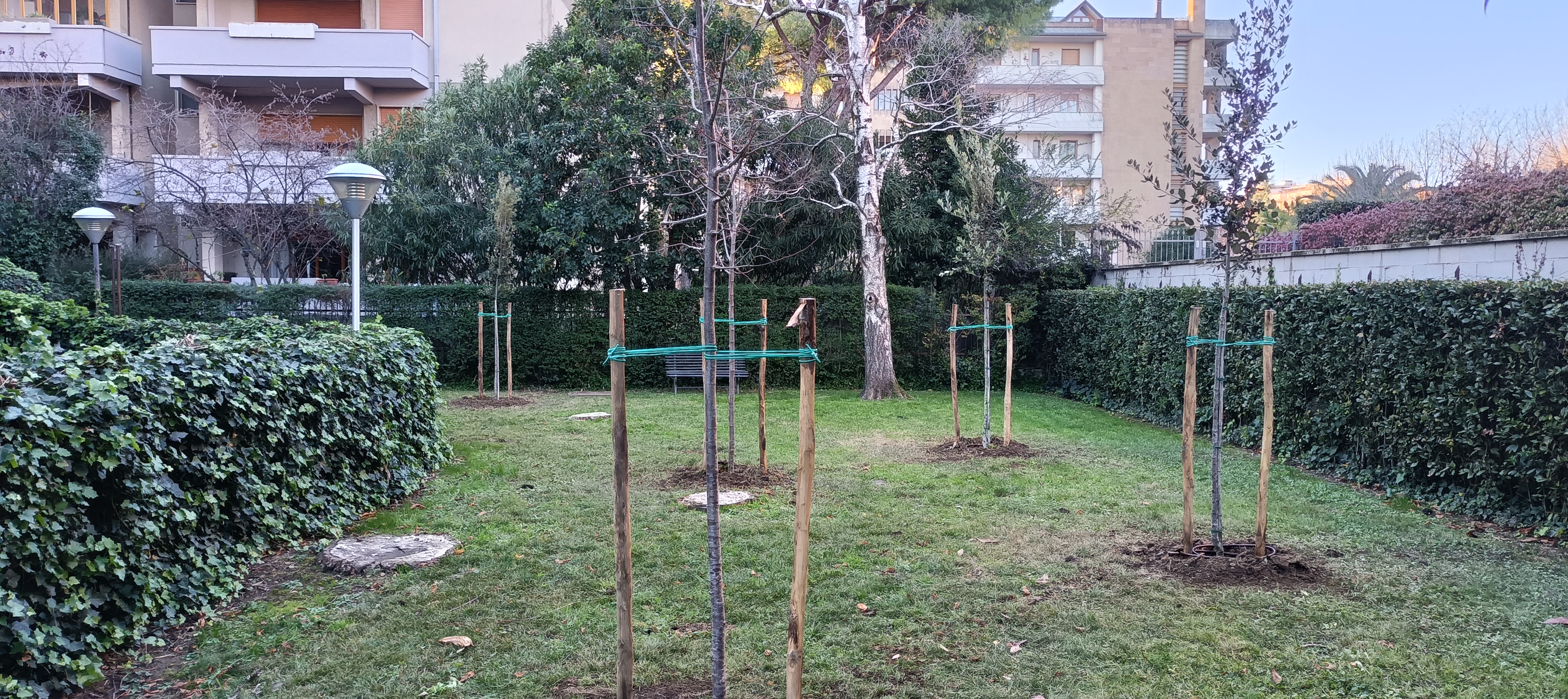 In questo giardino dopo la rimozione di 5 pini , è stato messso a dimora 3 Lecci e 2 Tigli.
