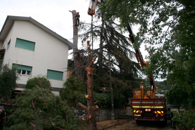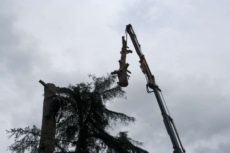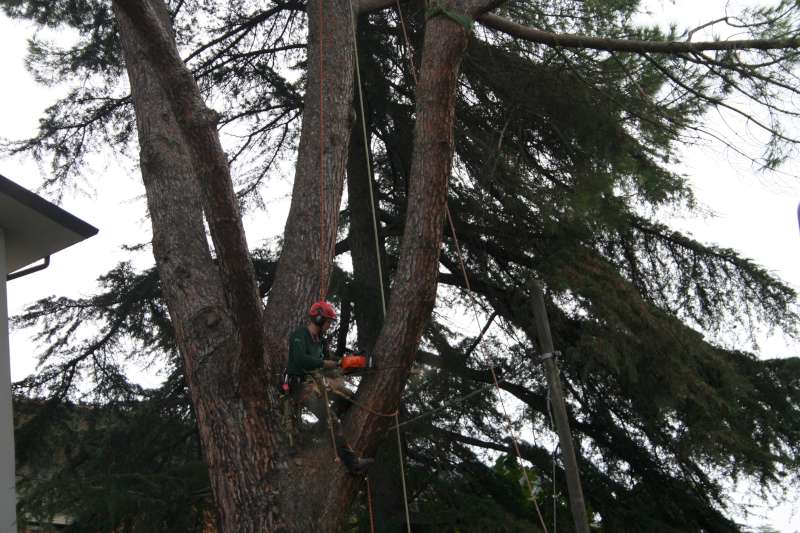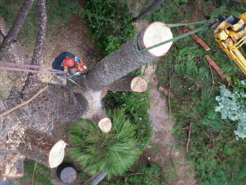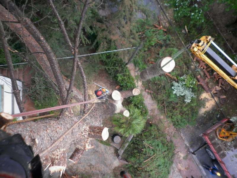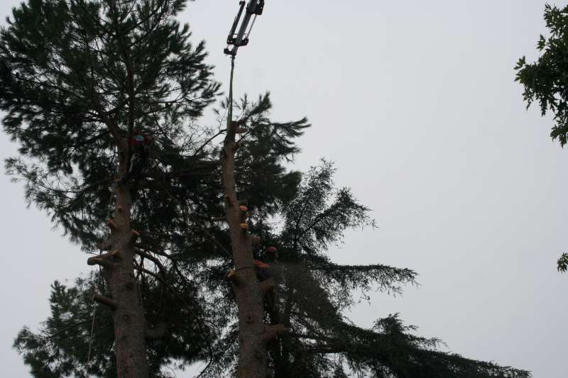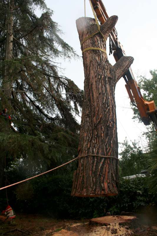 I motivi che ci hanno fatto optare per un abbattimento con ausilio di gru sono stati: lo spazio ristretto in cui era collocato l'albero,la vicinanza a manufatti(casa,ringhiere...) la presenza di fili del telefono, le dimensioni della pianta (oltre un metro di diametro alla base).